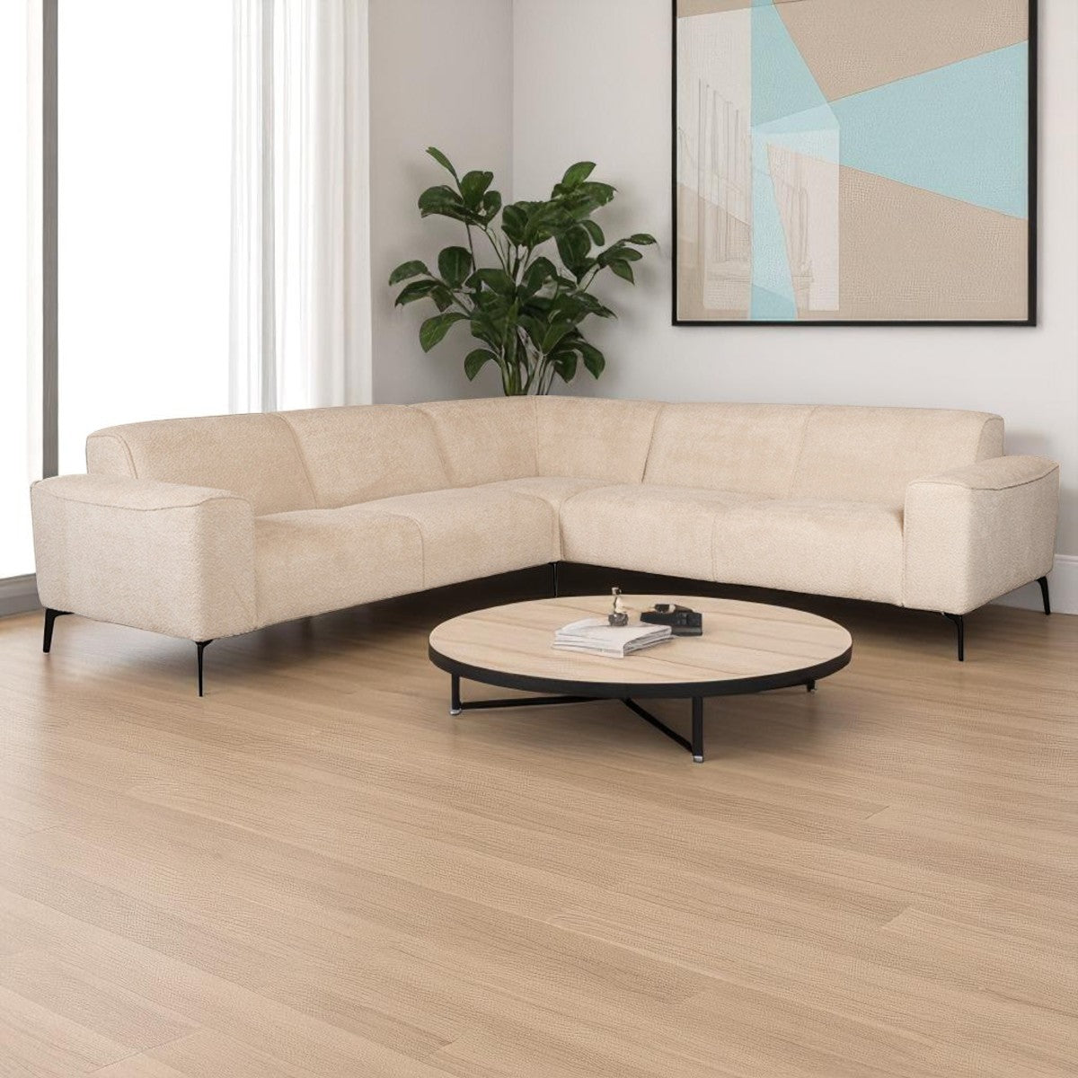 Ontdek de perfecte combinatie van stijl en comfort met de Scandinavische hoekbank Vegas bouclé beige linksrechts. Deze bank is een statement piece voor elke woonkamer, ontworpen met een moderne uitstraling die de essentie van Scandinavisch design belichaamt.